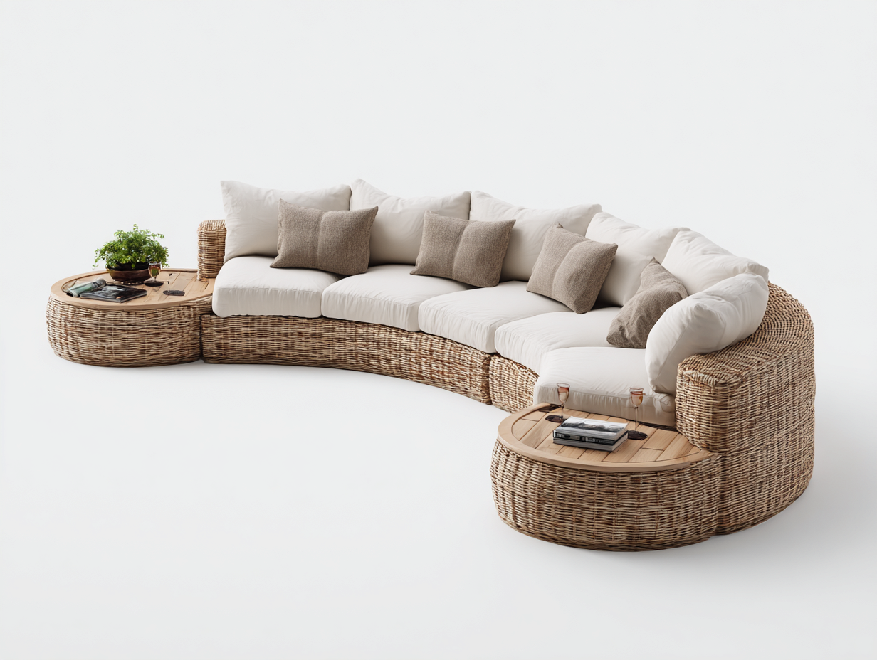 La configuration en angle avec silhouette arrondie optimise l'aménagement de l'espace extérieur. Les surfaces de pose intégrées de chaque côté du canapé offrent un support pratique pour les objets du quotidien, sans nécessiter l'ajout de mobilier complémentaire.