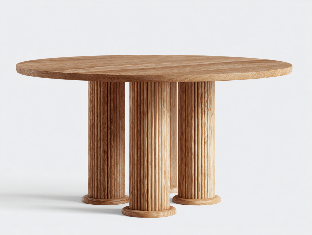 Fabriquée en bois de teinte naturelle, la table met en valeur un veinage visible et une finition soignée. Les pieds cylindriques à rainures verticales apportent une esthétique structurée et contemporaine, tout en assurant une excellente stabilité.
