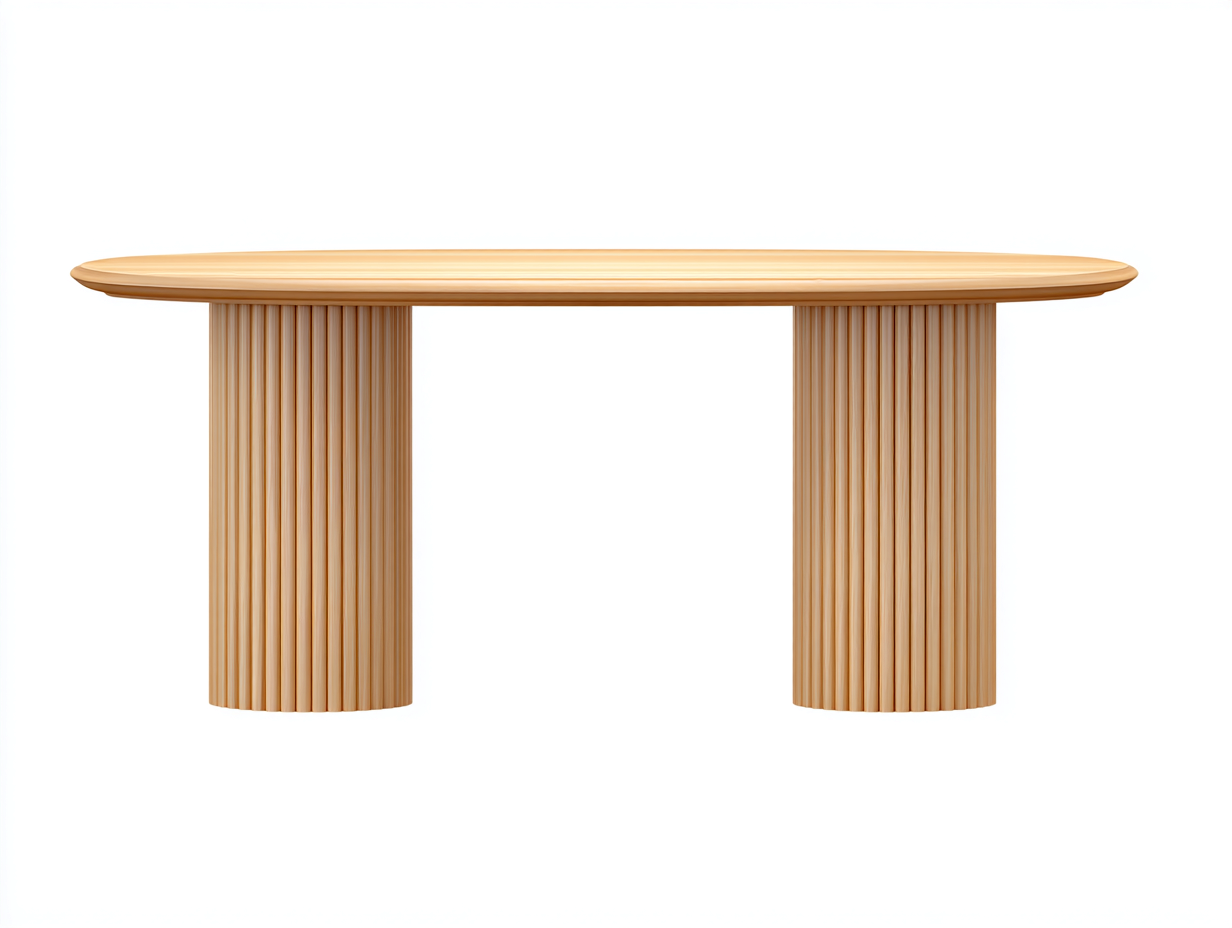 La table est fabriquée en bois de teinte naturelle, mettant en valeur un veinage régulier et une finition lisse. Le plateau ovale repose sur deux pieds cylindriques cannelés, offrant un rendu visuel structuré et stable, adapté à un usage en extérieur.