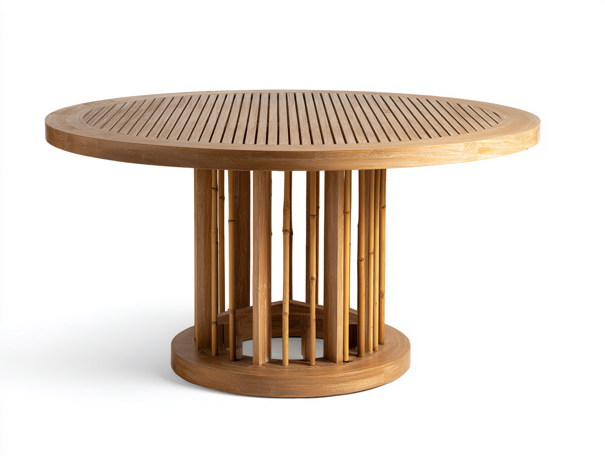La forme ronde facilite la circulation autour de la table et favorise la convivialité lors des repas en extérieur. Le pied central assure une bonne stabilité tout en laissant un espace dégagé pour les assises.